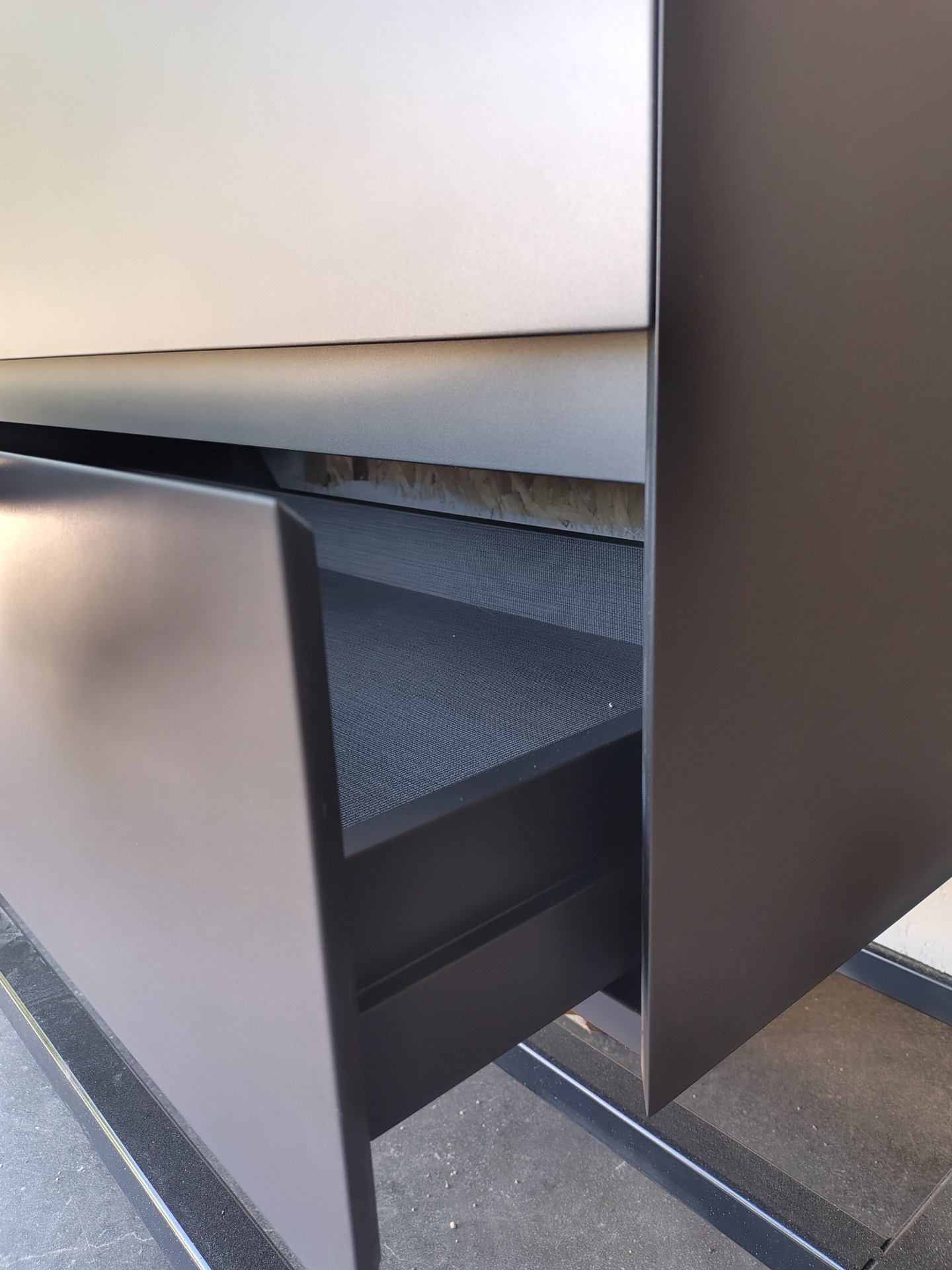 sospesa lunghezza 120 cm con finitura lmetal spazzolato, composta da udue cassetti realizzati con fianchi e frontali con taglio a 45 gradi
